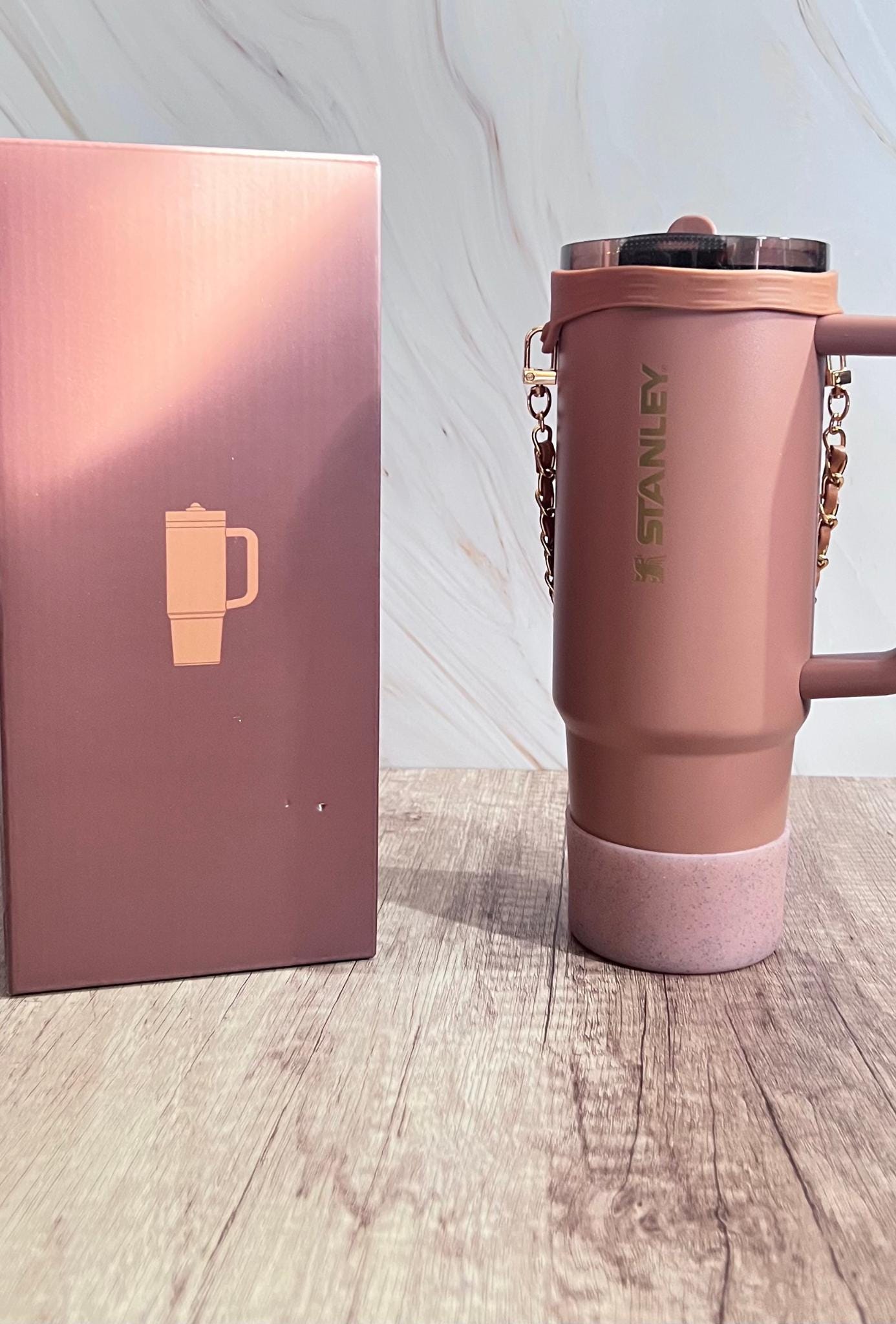 To complete the trio, an authentic designer 30 oz stainless steel tumbler ties the aesthetic together with its mocha‑inspired design. Built with a sturdy handle and convenient drinking spout, it keeps beverages hot or cold for hours — perfect for daily use, travel, or gifting.