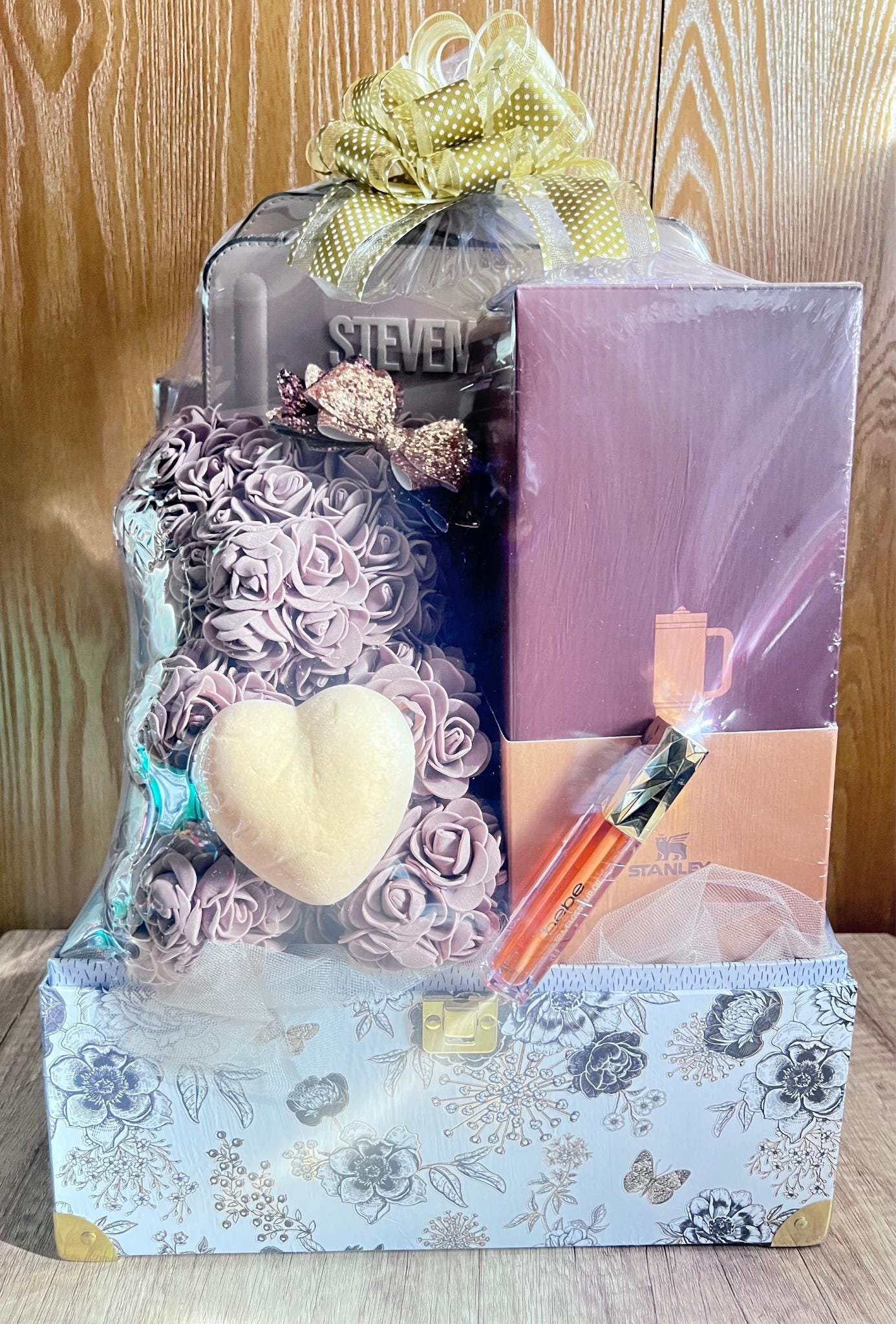 Elevate any occasion with this beautifully coordinated mocha‑themed gift set designed to impress. At the heart of the collection is a plush mocha‑colored Infinity Bear, finished with a sparkling glitter bow that adds warmth, charm, and a touch of glam. Soft, stylish, and display‑worthy, it’s the perfect keepsake for décor or gifting.